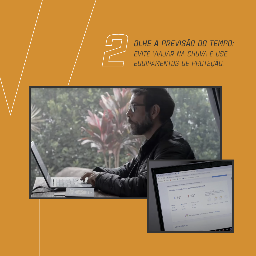 2 - Olhe a previsão do tempo: Evite viajar na chuva e use equipamentos de proteção.