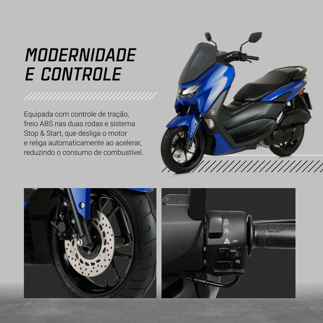 A Yamaha NMAX Connected 160 ABS é uma scooter urbana moderna, equipada com um motor de 160 cc, freios ABS, e conectividade Bluetooth para integração com smartphones. Ela oferece segurança com seu sistema de freios avançado e praticidade com funcionalidades de navegação e notificações em tempo real. Seu design aerodinâmico, iluminação em LED e assento confortável a tornam ideal para deslocamentos urbanos, combinando estilo, desempenho e tecnologia.