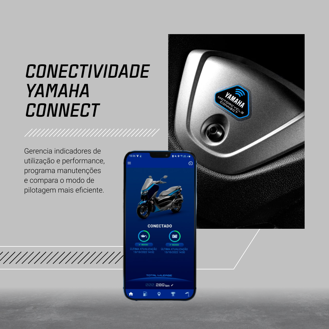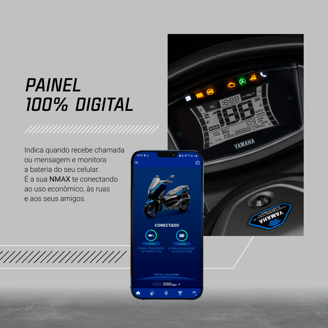 Indica quando recebe chamada ou mensagem e monitora a bateria do seu celular. É a sua NMAX te conectando ao uso econômico, às ruas e aos seus amigos.