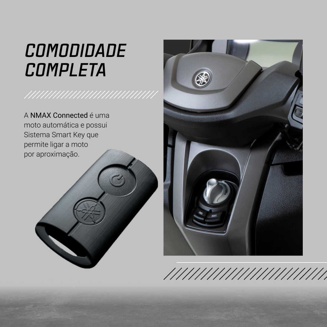 A NMAX Connected é uma moto automática e possui Sistema Smart Key que permite ligar a moto por aproximação.
